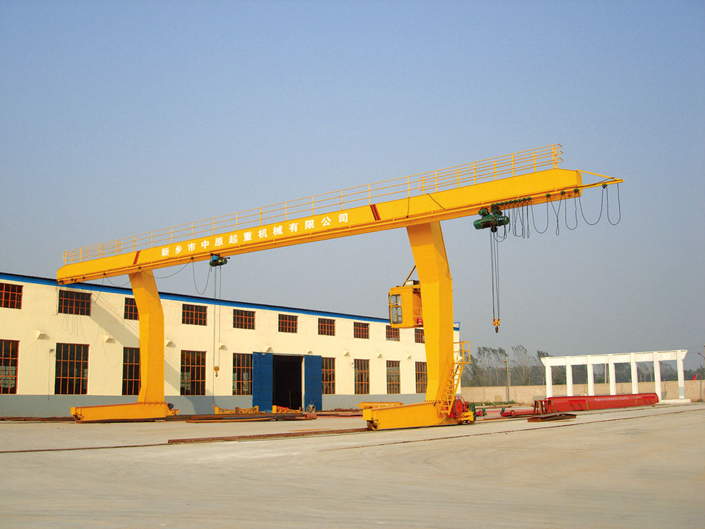它的金屬結(jié)構(gòu)像門形框架,承載主梁下安裝兩條支腳,可以直接在地面的軌道上行走,主梁兩端可以具有外伸懸臂梁。